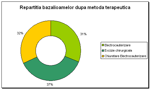 . Studiul metodelor terapeutice, realizat pe cei 300 de pacienti, a relatat ca tratamentul epitelioamelor bazocelulare ofera reale satisfactii deoarece, in conditiile alegerii unei metode terapeutice adecvate si a unei tehnici directe, se obtin vindecari in peste 90% din cazuri.