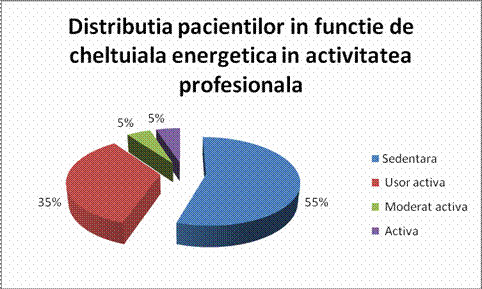 Se observa ca 55 % din pacienti au o activitate sedentara la locul de munca , ceea ce ne demonstreaza rolul sau in aparitia excesului ponderal , avand in vedere ca activitatea profesionala ocupa o mare parte din timpul unei zile. 35 % din subiecti afirma ca au o activitate usor activa in timp ce doar 5 % sunt activi la locul de munca.