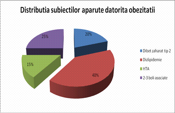 Astfel, din grupul nostru de studiu 40% au fost diagnosticati ci dislipidemie ,20%cu diabet zaharat,15 % cu hipertensiune arteriala, iar 25% prezinta boli asociate(boli cauzate de excesul ponderal).
