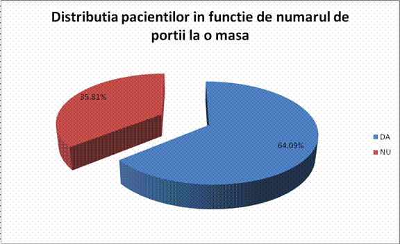 La aceasta intrebare privind marimea portiilor de mancare:64,09%afirma ca aleg portii de marime mare si doar 35,81% pe cele de marime mica.Marimea portiilor alimentare este o problema comuna majoritatii persoanelor supraponderale si obeze.82% dintre ei obisnuiesc sa manance seara tarziu iar restul de 18% afirma ca nu au acest obicei.Mancatul foarte tarziu seara este tot un factor predispozant.