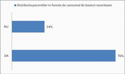 Se observa tendinta crescuta a subiectilor de a consuma bauturi racoritoare.Studiile din ultimea vreme le include si pe acestea ca facand parte dintre elementele cauzatoare ale supraponderabilitatii si obezitatii. Un studiu amplu despre efectele bauturilor racoritoare (chiar si dietetice) asupra greutatii corporale indica cresterea riscului de ingrasare in 41% la personale care consuma cel putin o doza de bautua racoritoare pe zi. Asadar din grupul studiat de noi in aceasta lucrare 76% dintre persoane afirma consuul frecvent al bauturilor racoritoare(fie ele dietetice sau nu) si doar 24% neaga consumul frecvent.