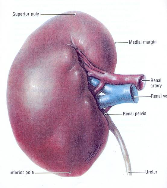 Rinichii au o margine externa convexa, o margine interna concava si doi poli: unul superior si altul inferior. Pe partea concava se afla hilul renal, alcatuit din artera si vena renala, limfaticele, nervii, jonctiunea uretero-bazinetala. Rinichiul drept este situat ceva mai jos decât cel stâng. Loja renala este limitata în sus de diafragm, în spate de ultimele doua coaste si dedesubtul lor de muschi si de aponevrozele lombare, iar înainte, de viscerele abdominale. In jos, loja renala este deschisa [de aici, usurinta cu care se produce ptoza renala].