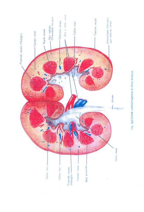 Aparatul urinar - este alcatuit din cei doi rinichi si de caile evacuatoare ale urnii: calice, bazinete, uretere, vezica urinara si uretra.