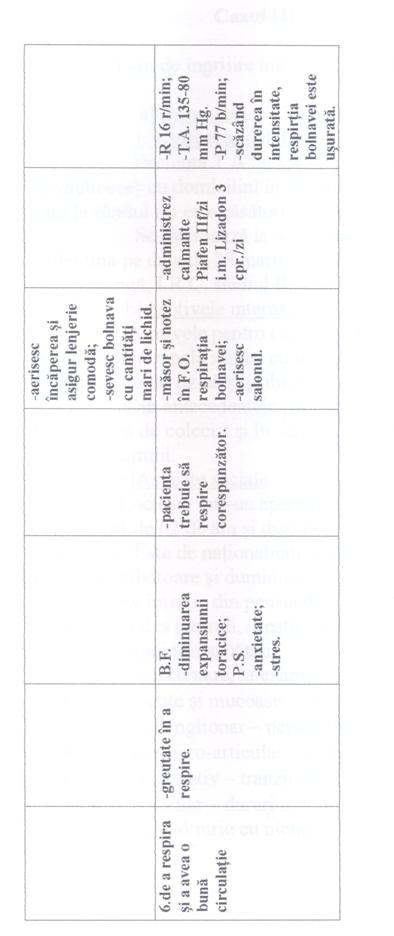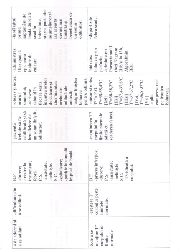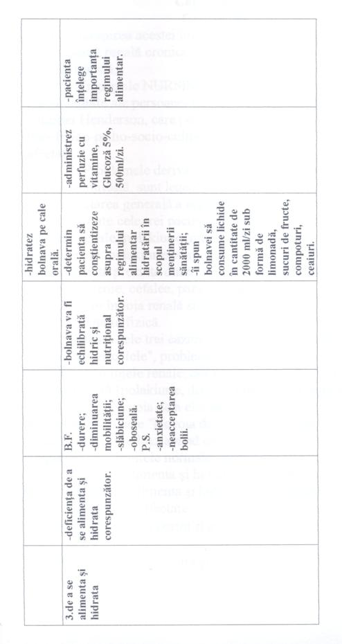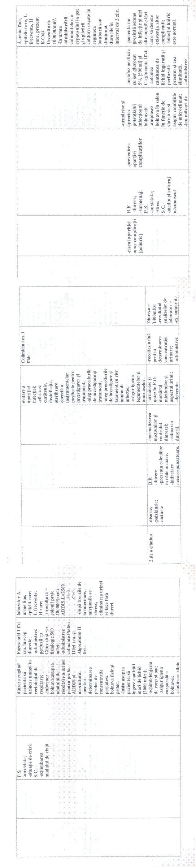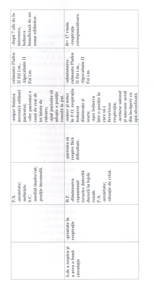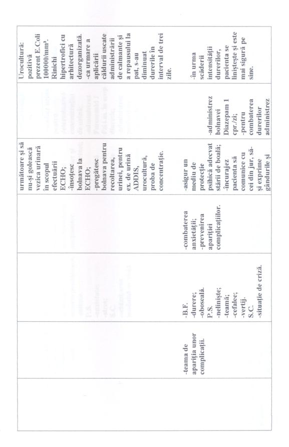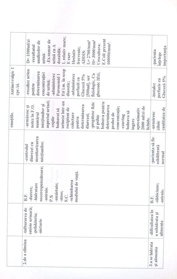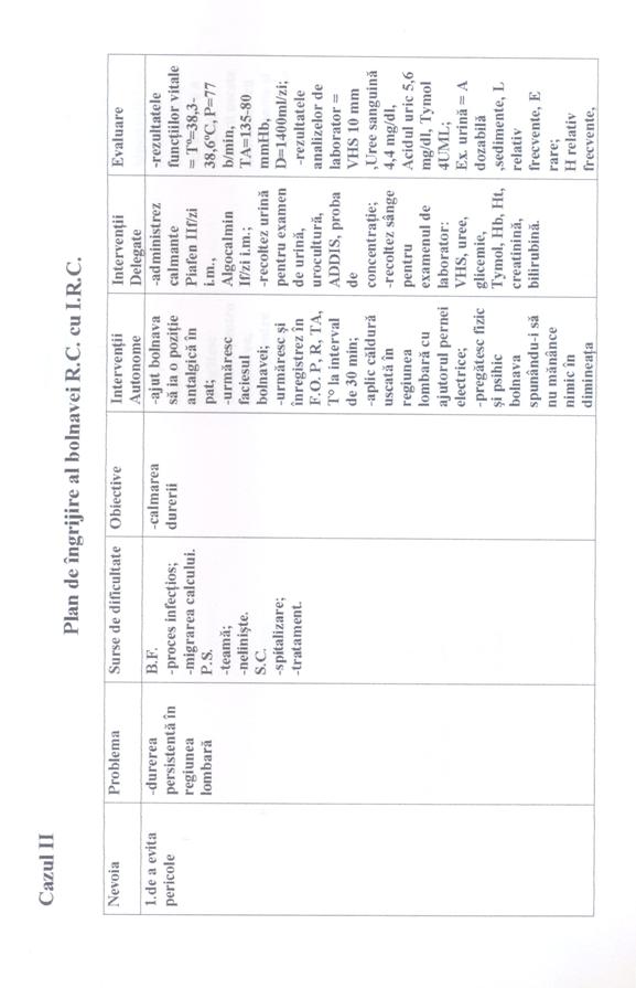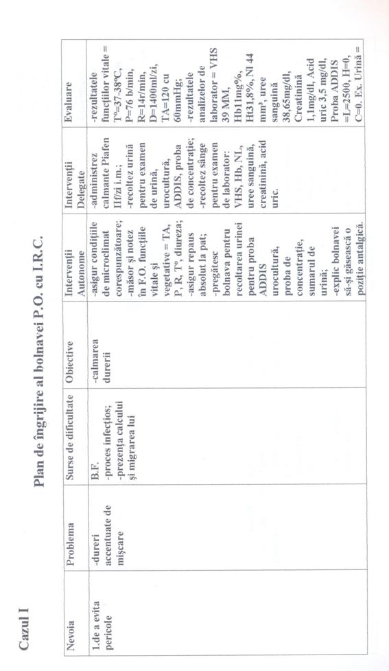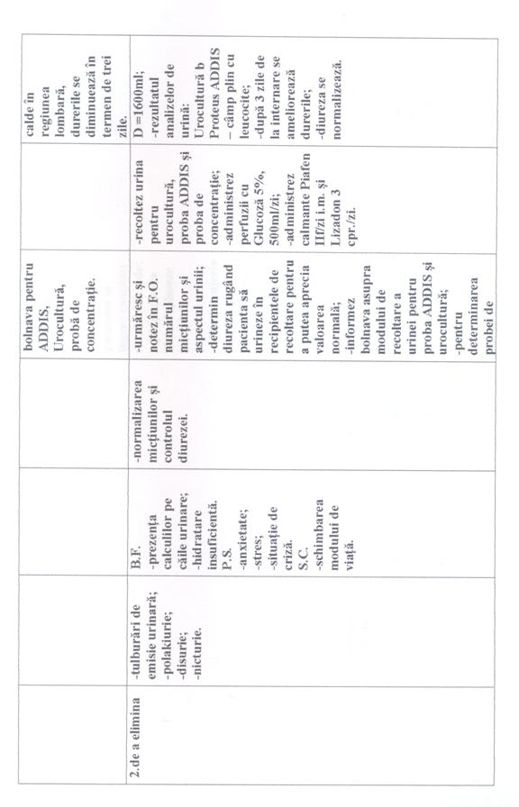 In toate cele trei cazuri prima nevoie afectata este "Nevoia de a evita pericolele", problema a fost durerea colicativa persistenta în lojele renale; deoarece pacientele aveau tulburari de emisie urinara [polakiurie, disurie, nicturie]. A doua nevoie afectata este "Nevoia de a elimina" în toate cele trei cazuri. A treia nevoie afectata este "Nevoia de a mentine T° corpului în limitele normale" în primul caz având ca problema cresterea temperaturii corpului peste limitele normale; iar în celelalte doua cazuri este "Nevoia de a se alimenta si hidrata" deoarece pacientele prezentau dificultati în a se alimenta si hidrata corespunzator.