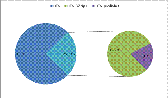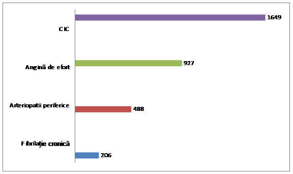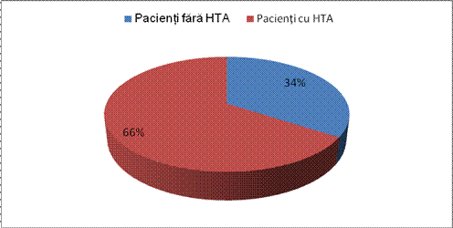 Comorbiditati asociate HTA au fost cardiopatie ischemica cronica cu 78,33%, angina pectoral de efort 44,03%, arteriopatii periferice 23,18% iar fibrilatia atriala cronica 9,78%.