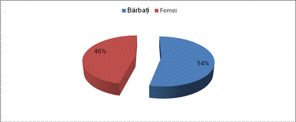 Distributia cazurilor de HTA in functie de sexe a fost de 54% barbati si 46% femei, afectarea fiind aproximativ egala.