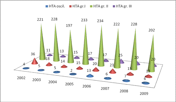 Din lotul de pacienti studiati 66 % au prezentat HTA esentiala, cu mici variatii de-a lungul anilor, incidenta maxima a fost de 71% in 2006, iar cea minima de 57,75% in anul 2004.