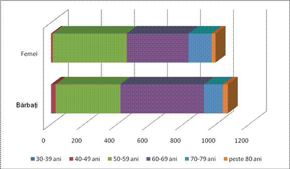 Grupa de varsta cea mai afectata a fost grupa 60-69 ani cu un procent de 41,85%, respectiv grupa 50-59 de ani cu 39,95%. Gradul de afectare avand in vedere atat grupele de varsta cat si sexul pacientilor, releva o incidenta mai mare a HTA la femei la grupa de varsta 50-59 ani cu procentul de 46,09%(din totalul de 974 persoane de sex feminin), in timp ce la barbati incidenta cea mai mare se gaseste intre 60-69 de ani cu 38,09%(din totalul de 1331 persoane de sex masculin).