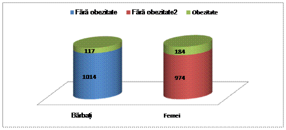 În ceea ce priveste obezitatea, 14,29% din persoane asociaza si obezitate, aceasta fiind mai frecventa in randul femeilor-18,8% fata de 10,3% in cazul barbatilor. Este mult mai frecventa asocierea HTA-DZ tipII-Obezitate care reprezinta 4,89% fata de asocierea separata a HTA cu obezitatea-9,4%, sau a DZ tip II cu obezitatea-1,99%.