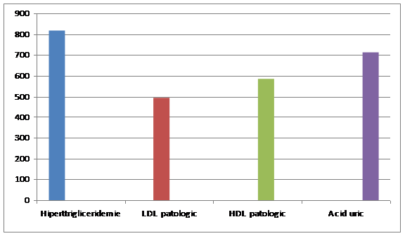 Cu privire la studiul analizelor de laborator 38,85% prezinta hipertrigliceridemiei, 27,88% valori scazute ale HDL-colesterolului, 23,56% valori ridicate ale LDL-colesterolului, iar 33,96% valori ridicate ale acidului uric.