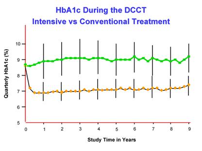 Implicarea masurarii hemoglobinei glicozilate, mai precis masurarea unui dezechilibru metabolic se poate evidentia prin graficul de mai jos. La o evolutie de mai putin de 10 ani si cel putin o complicatie microangiopatica se observa o valoare de 9.18, fata de 9.17, comparand ambele tipuri de diabet.