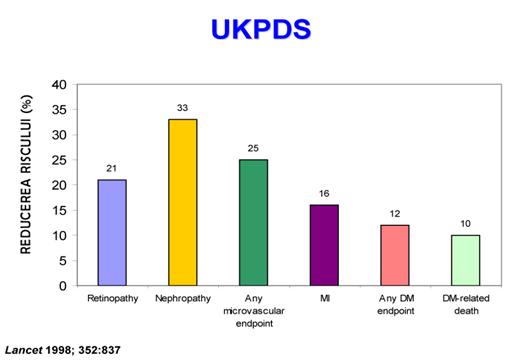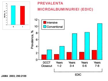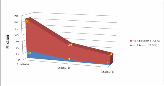Se remarca si o evolutie ascendenta procentuala in cazul studiului curent efectuat; astfel pentru o hemoglobina de peste 7.5% la stadiul A s-a gasit un procent de 79.77%, la stadiul B un procent de 88.89% iar la stadiul C un procent de 93.34% din numarul total de cazuri. Studiile DCCT si EDIC prezentate anterior sustin aceste concluzii.