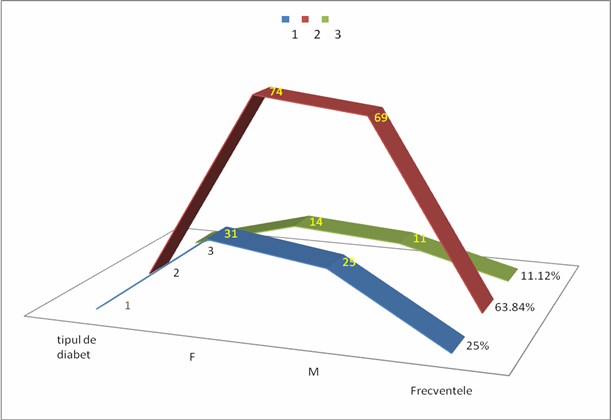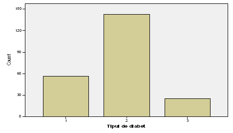 Rezulta ca in populatia aleasa de noi, un pacient de varsta inaintata poate avea si diabet de tip I si diabet de tip II sau tipul nedeterminat. Graficul insa arata si cateva subtilitati: tipul II predomina dupa varsta de 40 ani, in lotul nostru fiind mai multi pacienti cu asemenea tip; t ipul I prezinta o distributie in special la nivelul extremelor intervalului de varsta, iar tipul nedeterminat domina intreaga scala