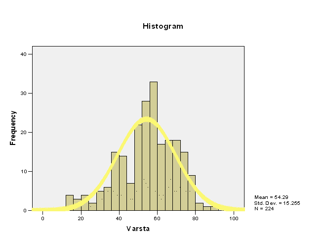 Mai sus e prezentata distributia ce rezulta din prelucrarea datelor variabilei varsta. Este vorba despre o distributie de tip Gaussian, cu media la aproximativ 54 ani. De asemenea pe axa ordonatelor sunt trecute frecventele fiecarei varste in parte. Frecventele cele mai mari sunt in intervalul varstei de [50, 70] ani.
