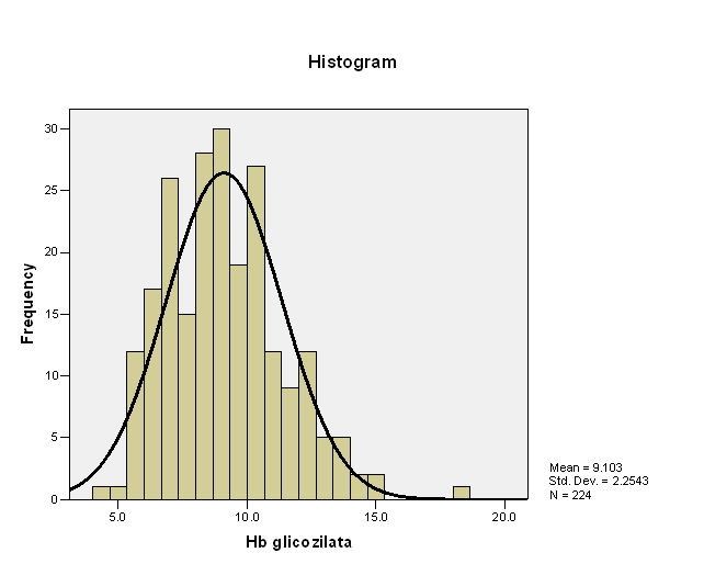 Media este de aproximativ 9.103 ceea ce arata ca acest parametru a avut valori mari, deci diabetul gasit la pacientii respectivi a fost in stadii avansate. Deviatia standard are valoarea de 2.254 ceea ce in contextul unui esantion aleator ales este o valoare medie. Se observa de altfel o valoare mult crescuta de maxim: 18.3 si un minim de 4.2, cu o diferenta semnificativa intre ele, desi lotul a fost omogen.