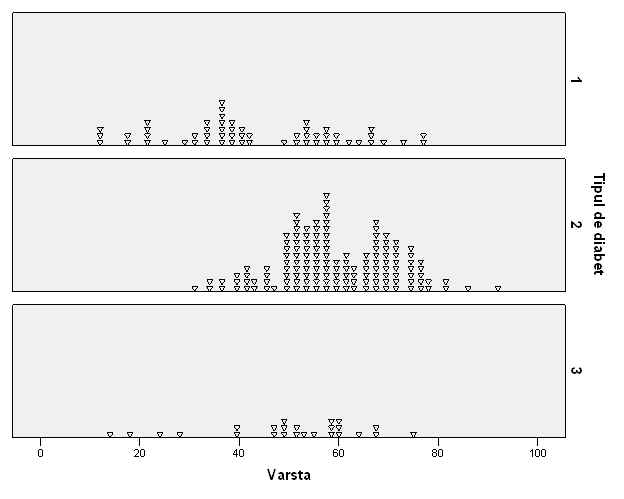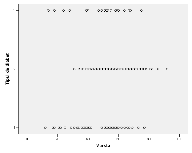 Corelatia cu varsta arata ca tipul de diabet in studiul nostru nu s-a asociat semnificativ cu varsta pacientilor (r=0.257, DF=222, p<0.01). Mai jos este si diagrama prin puncte care arata ca nu este nici o relatie intre varsta si tipul de diabet.