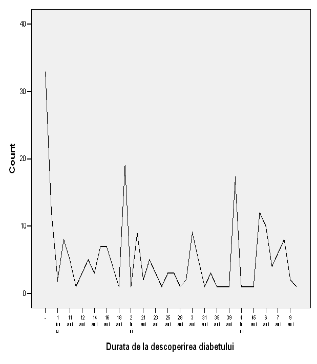 Urmatoarea variabila studiata este durata de la descoperirea diabetului. Pe grafic se observa doua picuri la 20 si 40 de ani si o distributie aproximativ egala per numar de cazuri. Ultimul desen subliniaza alte aspecte: