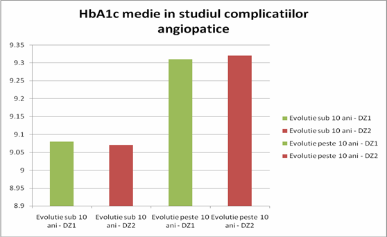 In schimb la o evolutie de peste 10 ani, media valorii hemoglobinei glicozilate masurate a crescut semnificativ (9.31), existand deci o legatura intre valoarea HbA1c masurata si evolutia complicatiilor pe termen lung.