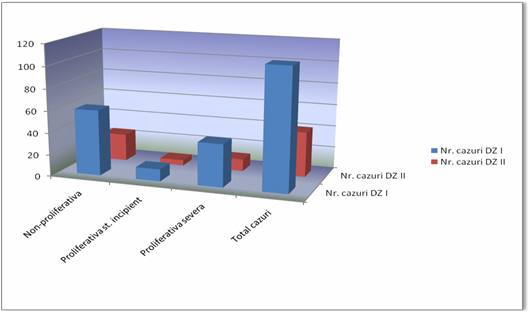 Din cele 151 de cazuri 110 sunt cei care au diabet de tip I iar 41 cazurile cu diabet de tip II. Se observa clar ca procentual stadiul non-proliferativ este predominant, astfel pentru diabetul de tip I raportat la cele 110 cazuri din esantion se remarca un procent de 54.54%, deci mai mult de jumatate.