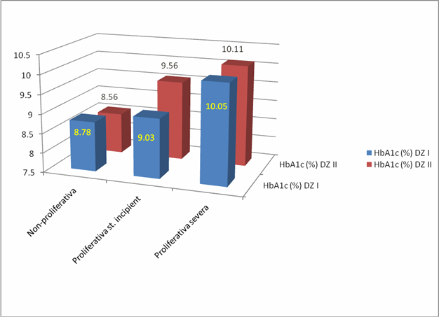 Ca medie a valorilor, pentru diabetul de tip II valoarea (9.28%) este mai mare fata de diabetul de tip I (9.41%). Concluzia care se trage este ca in cazul diabetului de tip II se descopera tardiv retinopatia comparativ cu diabetul de tip I. In ce priveste corelatia cu HbA1c a retinopatiei s-a observat ca nu exista o relatie semnificativa intre stadiul retinopatiei si diabetul zaharat de tip I si II (r=0.028, p<0.01). De altfel, se poate remarca de asemenea ca exista o variatie a stadiului retinopatiei conform cu cresterea HbA1c, ceea ce correspunde studiilor efectuate. Ceea ce inseamna ca la un nivel ridicat al HbA1c se descopera clinic un stadiu avansat al retinopatiei.
