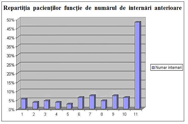 In ceea ce priveste numarul de internari anterioare ale bolnavilor prezenti in lotul de 110 pacienti luati in studiu, mai mult de jumatate − 60 de pacienti, reprezentand 54,59 % − se aflau la mai mult de 10 internari anterioare.