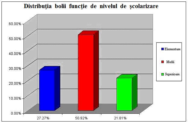 . Desi considerate o afectiune a persoanelor cu pregatire superioara, datele prezentului studiu relava cea mai mare frecventa a bolii in randul persoanelor cu pregatire medie, in procent de 50,92 % urmate de cele cu studii elementare 27,27 % , in timp ce pe ultimul loc se plaseaza categoria persoanelor cu studii superioare- 21,81 %.