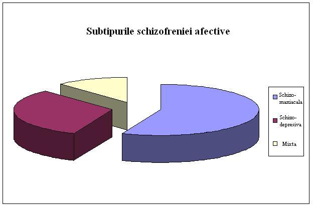Conform procentajului, se constata prezenta intr-o proportie relativ mare, a tulburarii schizoafective de tip maniacal (56,36 %), urmata de tulburarea schizoafectiva de tip depresiv (31,81 %), si tocmai pe locul trei tulburarea schizoafectiva de tip mixt intr-o proportie de 11,83 %.
