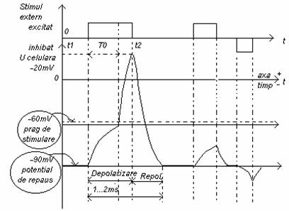 Daca asupra celulei se actioneaza din exterior prin mijloace mecanice , chimice, electrice , termice, celula va fi stimulata, caracteristicile membranei se modifica. Membrana celulara se va deschide pentru ionii de Na+ care patrund in celula, marind potentialul electric din exterior. Daca stimulul din exterior este suficient de puternic si aduce potentialul din interior fata de exterior pana la 131j97b o anumita valoare numita prag , procesul de trecere al ionilor nu mai poate fi controlat de stimul si este un fenomen de avalansa, iar celula este depolarizata. Depolarizarea se stabilizeaza pentru o scurta perioada, cand IK + I1N0+ =0 de unde rezulta valoarea Ud = +20mV pentru potentialul de depolarizare maxima.