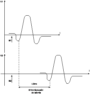 Raspunsul electric R, sub forma potentialului de actiune muscular se inregistreaza grafic. In exemplul considerat, distanta dintre punctele utilizate, succesiv, de 36 cm si diferenta duratelor de latenta de 4,5ms, conduc la viteza de propagare nervoasa pe tronsonul 1-2 de aproximativ 80 m/s.