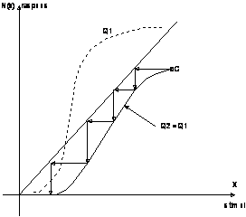Sa examinam din punct de vedere al stabilitatii, actiunea unui stimul oarecare, de exemplu cel corespunzator punctului A de pe neliniaritatea din figura 1.10. Raspunsul respectiv este N(XA) si acestuia ii corespunde in nodul urmator un stimul (punctul B), acestuia un raspuns (punctul C) si asa mai departe pana se atinge regimul stabil din punctul P2. In mod similar pornind de la E si urmarind linia franta si sensul sagetilor obtinem ca punct de echilibru originea O. Rezulta ca punctul P1 pe caracteristica neliniara este instabil; aceasta permite sa se defineasca factorul de siguranta intr-un mod simplu, prin raportul stimulilor aferenti regimului stabil activ (P2) si acelui instabil (P1), adica sub forma : S=X2/X1