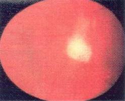 In stadiul acut al infectiei, examenul biomicroscopic evidentiaza precipitate si granuloame keratice, camera anterioara marita si cu aspect de flacara, sinechii posterioare. In cazurile severe se poate asocia hipopion.Vitrosul anterior prezinta celule inflamatorii numeroase, grupate, care impiedica examenarea fundului de ochi. Prin acest vitros se poate identifica, uniori, o masa alba, in periferia retinei, foarte asemanatoare cu retinoblastomul.Cazurile mai severe evidentiaza un vitros deosebit de tulbure, cu un exudat retinian si decolare de retina. In alte cazuri, reactia inflamatoare pote diminua in intensitate, lasand o masa alba inapoi a cristalinului, care reprezinta organizarea procesului inflamator intr-o membrana ciclica tipica.Aceasta membrana incepe in cadrul cel mai intens inflamat si progreseaza pana la nivelul suprafetei posterioare a cristalinului. Acest fapt implica, in general, un prognostic vizual sever si reprezinta o indicatie chirurgicala, cat mai repede cu putinta (fig. 15). In multe astfel de cazuri, pacientii dezvolta o sinechie posterioara extinsa, bombarea irisului si cataracta subcapsulara posterioara, care poate progresa la opacifiere cristalina totala si copilul dezvolta leucocorie.