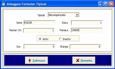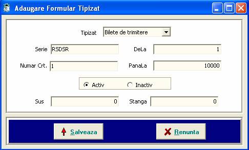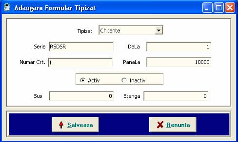 Se acceseaza, in functie de cerinte, fereastra de adaugare/modificare/stergere formulare tipizate pentru chitante.