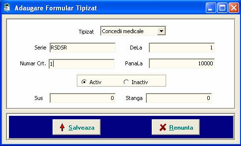 Se acceseaza, in functie de cerinte, fereastra de adaugare/modificare/stergere formulare tipizate pentru concedii medicale.