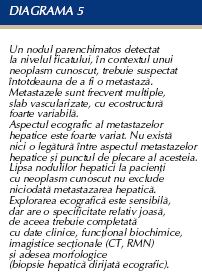 Un nodul vascularizat identificat la un pacient cu ficat necirotic si cu neoplasm cu alta localizare cunoscuta reprezinta, mai probabil, o metastaza 10). Dimensiunile metastazelor variaza de la cativa milimetri la cativa centimetri, in functie de natura tumorii primare. In cazul cancerelor gastrointestinale, tumorile metastatice sunt mai mari de 10 cm.