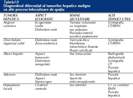 Diagnosticul diferential al tumorilor maligne cu alte tumori hepatice. Se face cu procesele inlocuitoare de spatiu cu consistenta parenchimatoasa. Se vor lua in consideratie contextul clinic, aspectul ecografic tipic si elemente ajutatoare. Adesea este necesar sa se apeleze si la alte metode de diagnostic (tabelul II 3) - diagrama 5.