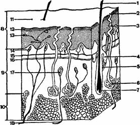 care 8. Epiderma; 9. Derma; 10. Ţesut celular subcutanat grasos; 11. Suprafata epidermei; 12. Strat cornos; 13. Terminatiile fibrelor nervoase în epiderma; 14. Corpuscul tactil; 15. Venula; 16. Arteriola; 17. Corpuscul Golgi; 18. Fibre nervoase |