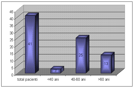 Am impartit cei 41 de pacienti in 3 categorii de varsta: pacienti sub 40 de ani, pacienti intre 40 si 60 de ani si pacienti peste 60 de ani (fig. 1).