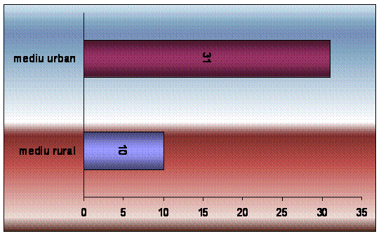 Repartitia dupa mediul de provenienta arata o predominanta a pacientilor din mediul urban (75%) fata de cei din mediul rural (25% - 10 pacienti), fapt care se poate datora atat unei mai bune retele de asistenta medicala prezenta in mediul urban, si prin urmare a unei adresabilitati crescute a pacientiilor la medic, cat si stilului de viata necorespunzator din mediul urban (sedentarism, supraaglomerare, poluare).