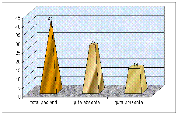 In lotul studiat 35% din pacienti prezentau guta. Aceasta cifra este concordanta cu cele din literatura de specialitate unde procentul celor cu guta asociata este de 41%