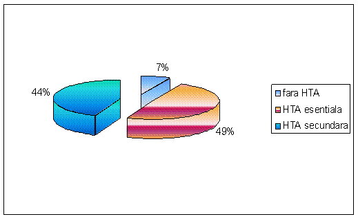 In lotul studiat 18 pacienti aveau HTA secundara renoparenchimatoasa (44%), 20 aveau HTA esentiala (49%), iar 3 (7%) nu prezentau HTA.