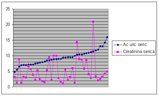 - sindromul de retentie azotata - practic toti pacientii au avut cresteri ale creatininei serice peste 1 mg/dl, iar 88% dintre ei prezentau si valori ale ureei sangvine peste 40 mg/dl. In ceea ce priveste valoriile uricemiei - doar 3 pacienti aveau acidul uric plasmatic < 7 mg/dl;