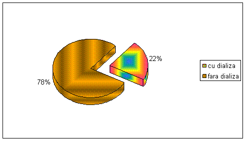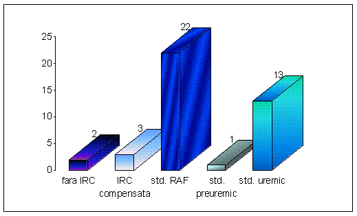 Din cei 41 de pacienti studiati, doar 2 nu prezentau insuficienta renala cronica, 3 aveau IRC in stadiul de deplina compensare, 22 aveau IRC in stadiul de retentie azotata fixa, 1 - IRC in stadiul preuremic si 13 - IRC stadiul uremic.