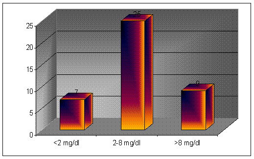 Toti cei 41 de pacienti aveau creatinina serica > 1 mg/dl (>1.11 mg/dl). Dintre acestia 7 aveau o crestere usoara a creatininei (< 2 mg/dl), 25 prezentau o crestere moderata a creatininemiei (2 - 8 mg/dl), iar 9 prezentau o crester severa a creatininei serice, peste 8 mg/dl (figura 12).
