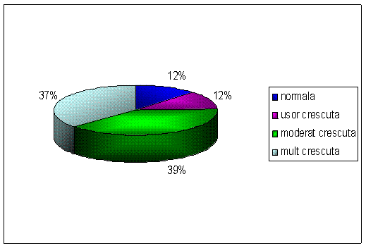 Din cei 38 de pacienti cu hipertensiune (atat esentiala, cat si renoparenchimatoasa), 3 aveau HTA stadiul 1, 22-HTA stadiul 2 si 13-HTA stadiul 3 (fig. 7 si 8).