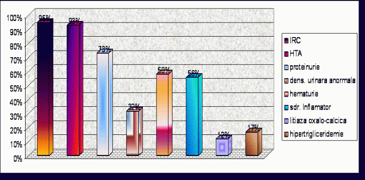 - insuficienta renala cronica a fost intalnita in 95% din cazuri, acest procent fiind mult mai mare decat cel din literatura de specialitate (10-25%). Acest lucru se datoreaza in principal faptului ca studiul a fost efectuat intr-o clinica de nefrologie.