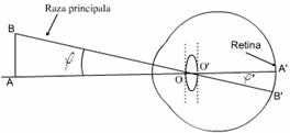 Pentru a explica formarea imaginii surselor luminoase punctiforme, vom studia formarea imaginii unui obiect AB, perpendicular pe axa optica a ochiului, in verful caruia se afla sursa punctiforma de lumina, ca în urmatoarea figura