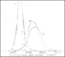 Confirmarea teoriei Young-Hemholtz s-a realizat prin identificarea în retina a trei tipuri de conuri, având spectrele de absorbtie ca în urmatoarea figura: