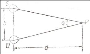 Observatorul cu ochiul stâng în pozitia S si cu ochiul drept în pozitia D, observa punctul P, aflat la distanta d. Unghiul subîntins de catre linia principala b în raport cu punctul de convergenta P se numeste unghi de convergenta sau paralaxa punctului P. Daca P se afla la infinit(d ), dar si în timpul somnului, paralaxa este zero. Aceste doua situatii corespund conditiilor cele mai odihnitoare pentru ochi. Pe masura ce obiectul se apropie de ochi, unghiul de convergenta creste, iar efortul de acomodare al ochiului creste progresiv(efortul de convergenta).