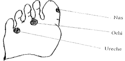 Puncte reflexogene. Punctul reflex al nasului este amplasat pe partea externa a degetelro mari, la baza articulatiei primei falange, in proiectie incrucisata.