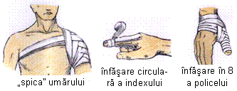 c) la nivelul toracelui: înfasarea circulara, spica sânului, bandajul Desault, banda-